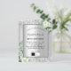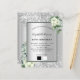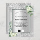 Faux silver looking background decorated with white florals, flowers, eucalyptus greenery and faux silver glitter, sparkles. Personalise and add your name, party details and attire colour palette. Black letters.
