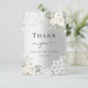 A modern and elegant feminine birthday thank you card. A faux silver looking background. Decorated with white roses, florals flowers and lace. On the front the text: Thank You