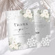 A modern and elegant birthday thank you card. A faux silver looking background. Decorated with white roses, florals flowers and lace. On the front the text: Thank You.