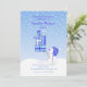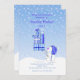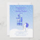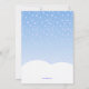A wintery invitation to party! The blue and white card features falling snow and an adorable snowman wearing a ski hat and carrying a pile of presents.