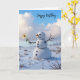 In a tranquil, snowy field, a snowman holds a daisy flower in one stick hand, while fluffy clouds drift across a brilliant blue sky, crafting a serene and picturesque scene that captures the essence of winter's beauty.