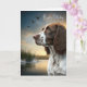 A springer spaniel dog with a brown and white coat gazes thoughtfully over a serene wetland landscape at dawn, where ducks take flight amidst tall reeds.