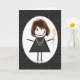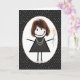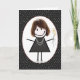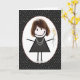 Cute stick figure girl with hair, sneakers, polka dot dress, pearl necklace, and daisy bouquet on black and white polka dot background.