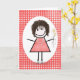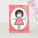 Cute stick figure girl with kinky hair, sneakers, gingham dress, pearl necklace, and daisy bouquet on red and white gingham background.