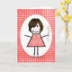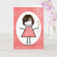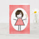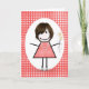 Cute stick figure girl with hair, sneakers, gingham dress, pearl necklace, and daisy bouquet on red and white gingham background.