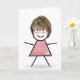 Cute stick girl with hair, red glasses, and gingham dress on a white background for sister's birthday.
