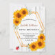 For a 50th (or any age) birthday party. A rustic white wooden background, decorated with sunflowers. A faux gold geometric frame and a cute red ladybug. Personalise and add the name, age and party details on front.