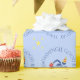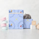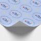 This swimming-themed wrapping paper has dark blue text that can be edited for your preferred greeting, or you can use: "HAVE A SWIMMINGLY GOOD BIRTHDAY". The design shows a pictogram swimmer carrying a present through the waves, and wearing a party hat. The background is pale blue, and there are extra yellow stars.