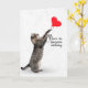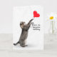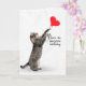 Playful grey tabby cat with red heart balloon on crinkled white background.