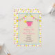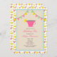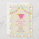 A birthday party invitation featuring a tea party theme. Invite has an illustration of a pink teacup with lemon at top. Invite also features solid and gingham bunting at top and a pink rose and lemon pattern background. Personalise the text with details of your occasion.