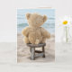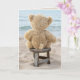 Cute brown teddy on rustic wooden stool on the beach looking at water.