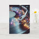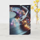 A sleek contemporary turntable spins a black vinyl record with neon dancing music notes.