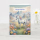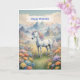 Send wishes for a magical birthday. Wish someone a happy unicorn birthday. A dreamy image of a white unicorn with a rainbow main standing in a field of flowers. in the background are majestic mountains.The perfect card to give those who love magical and mystical unicorns.