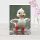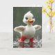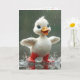 A happy white duckling wearing red rain boots splashes joyfully in puddles.