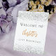 A welcome sign for a girly and glamourous 21st (or any age) birthday party. A stylish white background decorated with faux silver glitter sparkles. Personalise and add a name and age 21. Black and golden text.