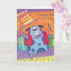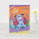 A colourful design of a dog on a greeting card surrounded by many gifts such as cake and other present for its friend.