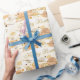 Birthday Gift Wrap is shown with a lovely modern art leaves print in soft neutral tones with a matte gold coloured text in fancy script of Happy Birthday. .