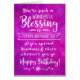 Wish someone a happy birthday while reminding them what a blessing they are in your life with this elegant hand lettering style typography design. Front of card features message in white, "You're such a wonderful blessing to everyone who knows you and you spread kindness & cheer wherever you go. Happy Birthday!" Design appears on digitally textured purple watercolor background