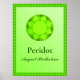 Poster in a digital illustration of a peridot gemstone, the birthstone for August, shades of lime green, bordered in a peridot crystal pattern