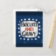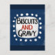 A fun and cute typographic southern food design that says "Biscuits And Gravy". It has black and red text on a white rectangle with funky, playful white dots surrounding it, all on a blue background.