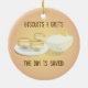 Ornament with a plate of smiling biscuits and a happy bowl of grits. The words “Biscuits and Grits the day is saved!” are part of the design and can be customised.