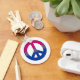 Basic Button Keychain with peace symbol design in colours of bisexuality pride flag; pink, purple and blue stripes, on a white background