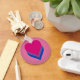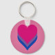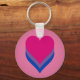 Basic Button Keychain with hearts design in colors of bisexuality; pink, purple and blue stripes pride flag, rainbow love design, on pink background