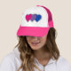 Hot Pink Trucker Hat with hearts design in colors of bisexuality; pink, purple and blue stripes pride flag, rainbow love design