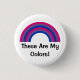 Round Button with bisexuality rainbow stripes of pink, purple and blue; bi pride flag design on white background, "These Are My Colours" template text, by pinkbrickroad