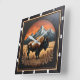 This illustration presents a bison standing in a grassy field, centrally framed within a circular medallion. Behind the bison, a rugged mountain range rises under an orange and red sky. The entire medallion is set against a dark, tooled leather background, giving the artwork a rustic and western-inspired feel. Stylised foliage decorates the foreground of the medallion.