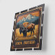 This illustration is a tribute to the American West, with a stylised bison in a grassy field. The background features a mountain range under a vibrant sunset. The artwork is given a distinctive, tooled leather texture and a decorative border. The words "BISON,, BUFFALO" are at the bottom.
