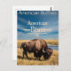A large American bison grazes in a field of tall grass near a river, with a blue sky and white clouds in the background.