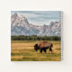 This photo features a solitary wild bison walks in front of the Teton mountain range in Jackson Hole, Wyoming.