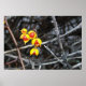 A cluster of bright bittersweet berries peeking out from grey twigs.