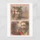 This postcard features a reproduction of a vintage lithograph advertisement for Wolcott's Instant Pain Annihilator. It shows a before and after of a man with a headache being afflicted by tiny demons in hell.