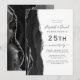The left-hand edge of this elegant modern wedding anniversary party invitation features a black watercolor agate border trimmed with silver faux glitter. The customizable text combines charcoal gray handwriting, copperplate and italic fonts on a white background. The reverse side features a matching black and silver agate design.