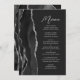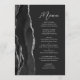 This elegant modern wedding menu features a black watercolor agate border trimmed with faux silver glitter. The customisable text combines silver grey handwriting script and sans serif fonts on an off-black background. The black and silver agate design is repeated on the reverse side.