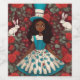 This adorable Alice in Wonderland features a whimsical burgundy background with red roses and white rabbits.