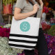 Personalise this chic black and white striped tote bag with your single initial monogram on a summery turquoise aqua circle badge for a tote that's uniquely yours! Design features a band of wide horizontal black stripes across the bottom, topped by your monogram in white on aqua. Makes a great gift for bridesmaids as well.