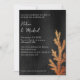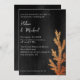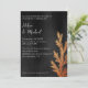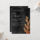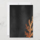 This elegant and romantic wedding invitation features a simple and modern winter theme. The background features a black foil texture pattern. A pine branch is placed on the right and features a copper foil gradient.