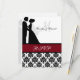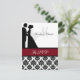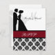 Black and white damask print with a cranberry band, a silhouette bride and groom, and areas you can personalise with your RSVP information, couple's names and monogram initial.