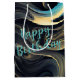 Abstract gold smoke swirls on black with an aqua-blue accent colour for a birthday.