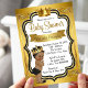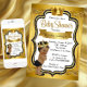 Black and gold baby shower invitation with cute African American prince wearing a black and gold crown on an elegant black and gold background. You can easily customise this beautiful black and gold baby shower invitation for your event by simply adding your details in the font style of your choice. This is a printed design with no real glitter.