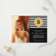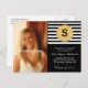 This graduation party postcard invitation features a preppy look with black and white stripes and a gold circle that has a customisable monogram. A photo frame on the front of this postcard allows you to add your favourite senior pictures. Customisable text on the back allows you to add a return address and more details.
