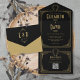 This chic black and gold 1920s art deco all-in-one wedding invitation features elegant typography and monogram initials. The invitation includes a perforated RSVP with your wedding website QR code and details. Designed by Thisisnotme©