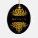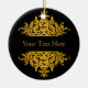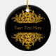 This pretty ornament features a black background and a gold baroque design on the front and back. A spot for a custom message or names adorns the front and back of the ornament.