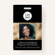This custom employee ID badge features a sophisticated black and gold design. A sample company or business logo is placed at the top which you can personalise to include your own custom logo or image. A sample staff photo is printed in the centre. The name of the employee, position, and place of employment is printed at the bottom.