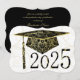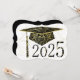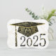 Floral designs on graduation cap, background and year. Black graduation cap on a white background. The back has a black background with gold lettering for the graduation announcements.