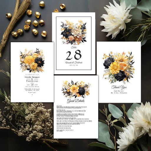 Black and gold floral wedding invitation with elegant typography customisable to your event specifics.