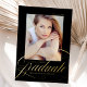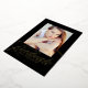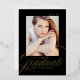 Elegant graduation announcement featuring the graduate's senior photo and "graduate" in a gold foil modern calligraphy script with a black background. Personalize the photo graduation announcements by adding the graduate's name, school name, and graduation year. The back of the graduation announcements features a stylish black and white trellis pattern.